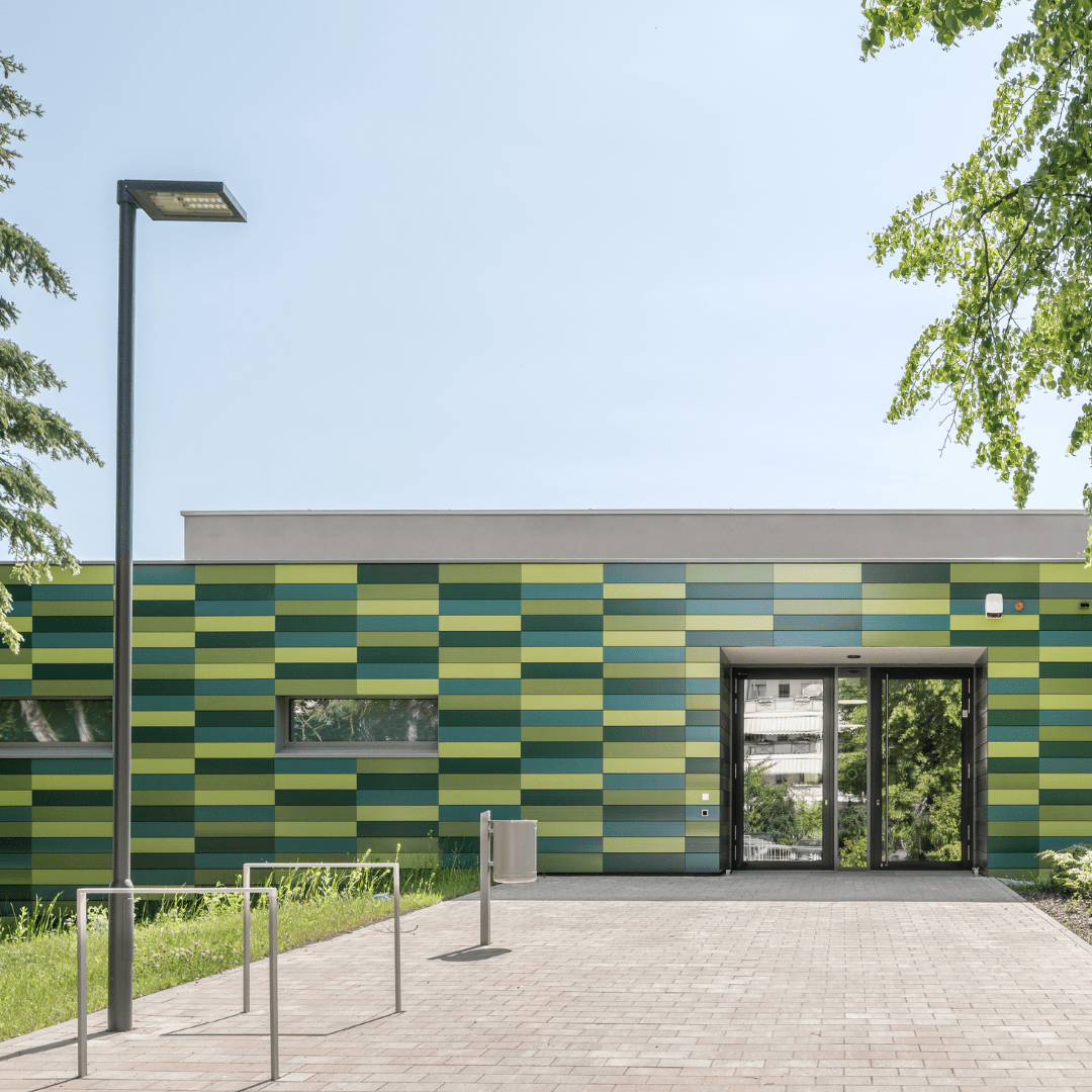 Новый спортивный зал школы Альберта Швейцера в Дрездене впечатляет своим ярким фасадом из керамики Tonality разных оттенков зеленого. Яркое сочетание цветов придает зданию живой, естественный вид и гармонично вписывается в окружающий ландшафт. Долговечная, не требующая особого ухода керамика обеспечивает высокую прочность и способствует экологичности. Вентилируемый керамический фасад сочетает в себе функциональность с современной эстетикой и является архитектурным заявлением.