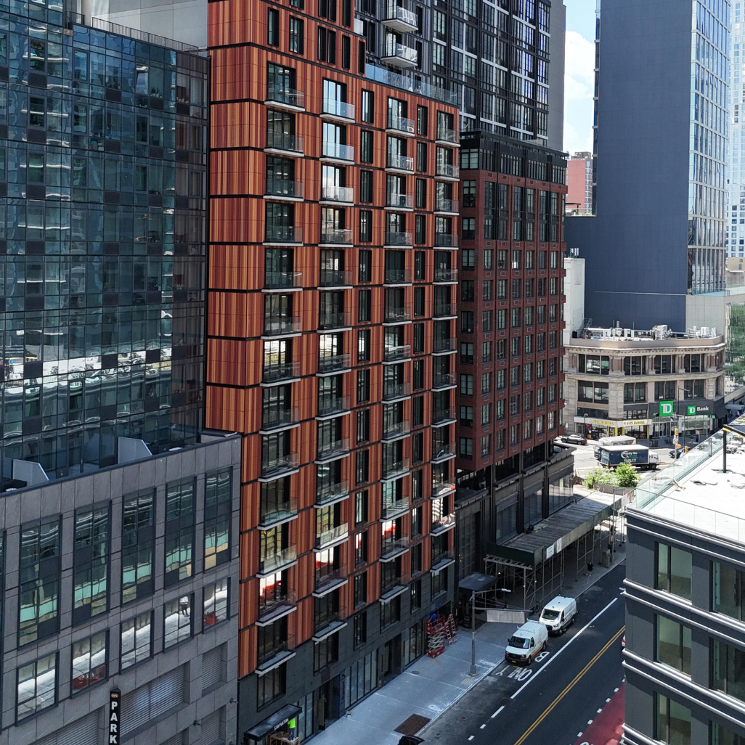23-этажная башня на Фултон-стрит в Бруклине получила вертикально структурированный керамический фасад TONALITY, спроектированный FRW Architects и реализованный в сотрудничестве с нашим местным партнером exoSurfaces по проектированию, планированию и логистике, а также с Sandstone Structures в качестве монтажной компании. Небольшой размер участка представлял собой особую проблему, поэтому архитекторы остановили свой выбор на серии ступенчатых керамических формованных элементов разных цветов — по мотивам соседних зданий — для создания визуальной глубины, несмотря на структурные ограничения. Использовались трапециевидные формованные детали, изготовленные методом экструзии, и плоские керамические элементы с единой оболочкой, которые были установлены в качестве кровельной системы с помощью системы вертикального монтажа элементов (VEM) TONALITY на подконструкции exoFRAMING. Такая комбинация обеспечивает точное выравнивание, непоследовательный монтаж и тонкие детали. В цветовом решении фасада использовано шесть специально подобранных оттенков красного и серого, которые создают живой, теплый фасадный эффект благодаря различной глубине керамических элементов, предлагая интересные визуальные эффекты как вблизи, так и на расстоянии.