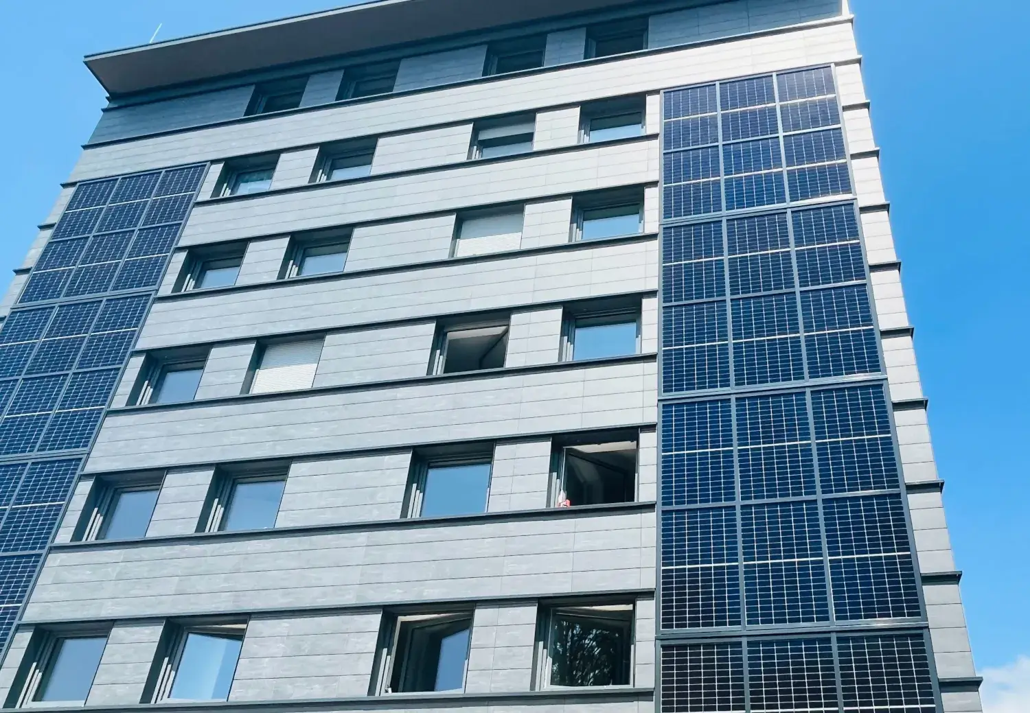 Auch die Fassade des Gebäudes wurde vollkommen umgestaltet und setzt die Modernisierung und Aufwertung im Inneren nach außen fort. Sie wirkt nun modern, gepflegt und klar strukturiert. Zudem fügt sich das Wohnheim trotz seiner Größe unauffällig in die bebaute Umgebung ein. Optisch auffällig an der Fassade ist das Wechselspiel zwischen den Photovoltaikmodulen und den Elementen der vorgehängten hinterlüfteten Fassade (VHF). Letztere stammt dabei aus dem Hause Leipfinger-Bader mit Tonality-Fassaden. Das Traditionsunternehmen ist spezialisiert auf vorgehängte hinterlüftete Keramikfassaden. Die hochwertigen Rohstoffe für die High-End-Keramik werden dabei regional im Westerwald gewonnen. Auch die Produktion erfolgt direkt vor Ort. Bei der Lindauer Sanierung fiel die Wahl aufgrund der besonderen Beschaffenheit des Untergrundes auf ein sehr leichtes Keramikelement. Während eine Dicke von 26 Millimetern grundsätzlich als Standard gilt, kamen in Lindau Elemente mit einer Dicke von nur 22 Millimetern zum Einsatz. Tonality lieferte diese in zwei verschiedenen Formaten: 300 mal 1000 Millimeter und 300 mal 1200 Millimeter. Beide Größen wurden im Wechsel horizontal an der Fassade montiert.