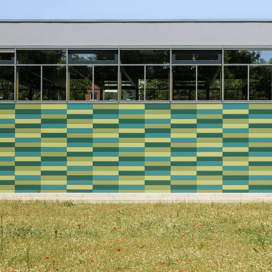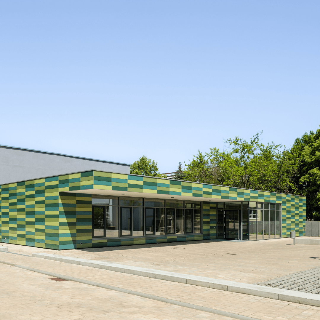 Новый спортивный зал школы Альберта Швейцера в Дрездене впечатляет своим ярким фасадом из керамики Tonality разных оттенков зеленого. Яркое сочетание цветов придает зданию живой, естественный вид и гармонично вписывается в окружающий ландшафт. Долговечная, не требующая особого ухода керамика обеспечивает высокую прочность и способствует экологичности. Вентилируемый керамический фасад сочетает в себе функциональность с современной эстетикой и является архитектурным заявлением.